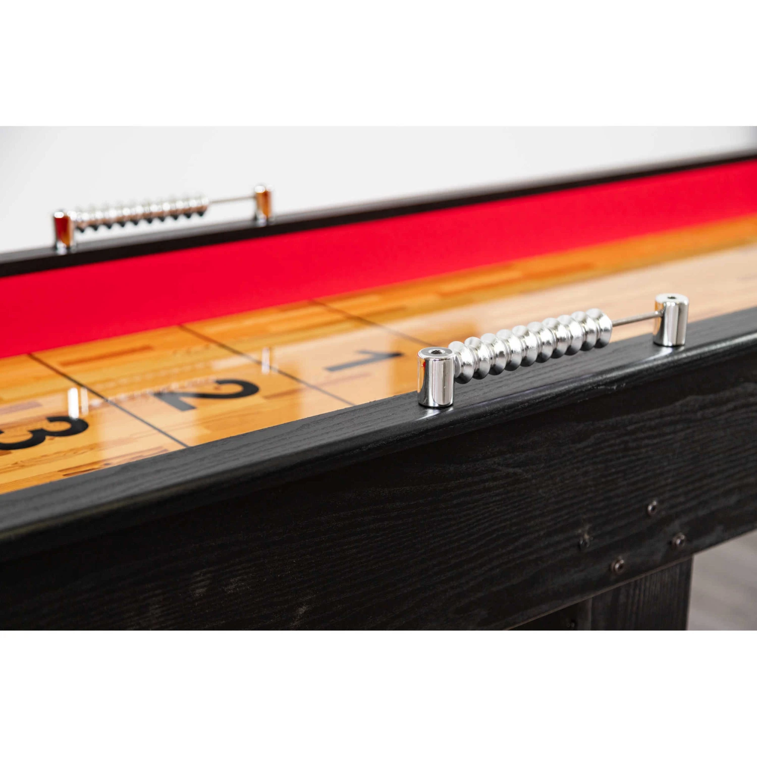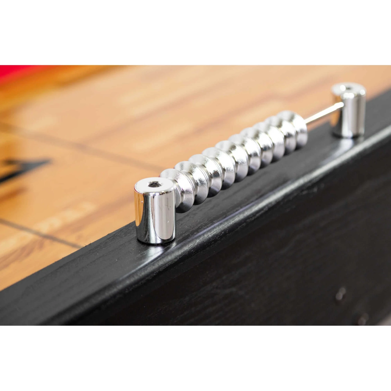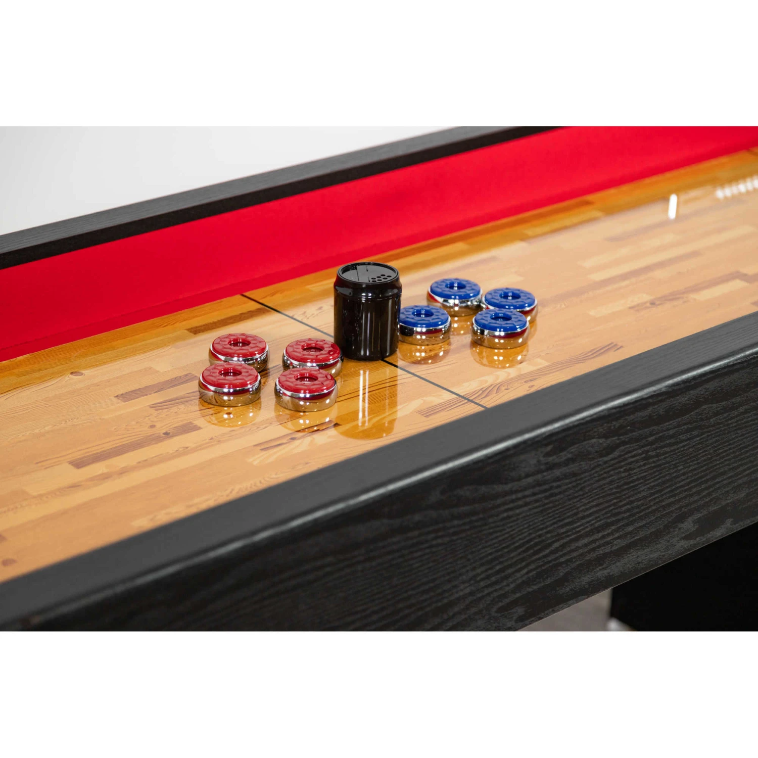 The 9-ft Avenger is the perfect table to introduce the exciting and fun game of shuffleboard to your family and friends, right in the comfort of your own home. The beautiful, black melamine cabinet and sturdy, pedestal legs with adjustable leg levelers provide optimum stability and level play. The Avenger features a super slick, poly-coated playing surface for smooth sliding action and padded gutters that reduce noise during play. It is crafted from engineered wood for durability. Accessories include: (8) shuffleboard pucks (4 blue, 4 red), (1) can of wax and (4) ABS abacus scoring units. Assembly required.