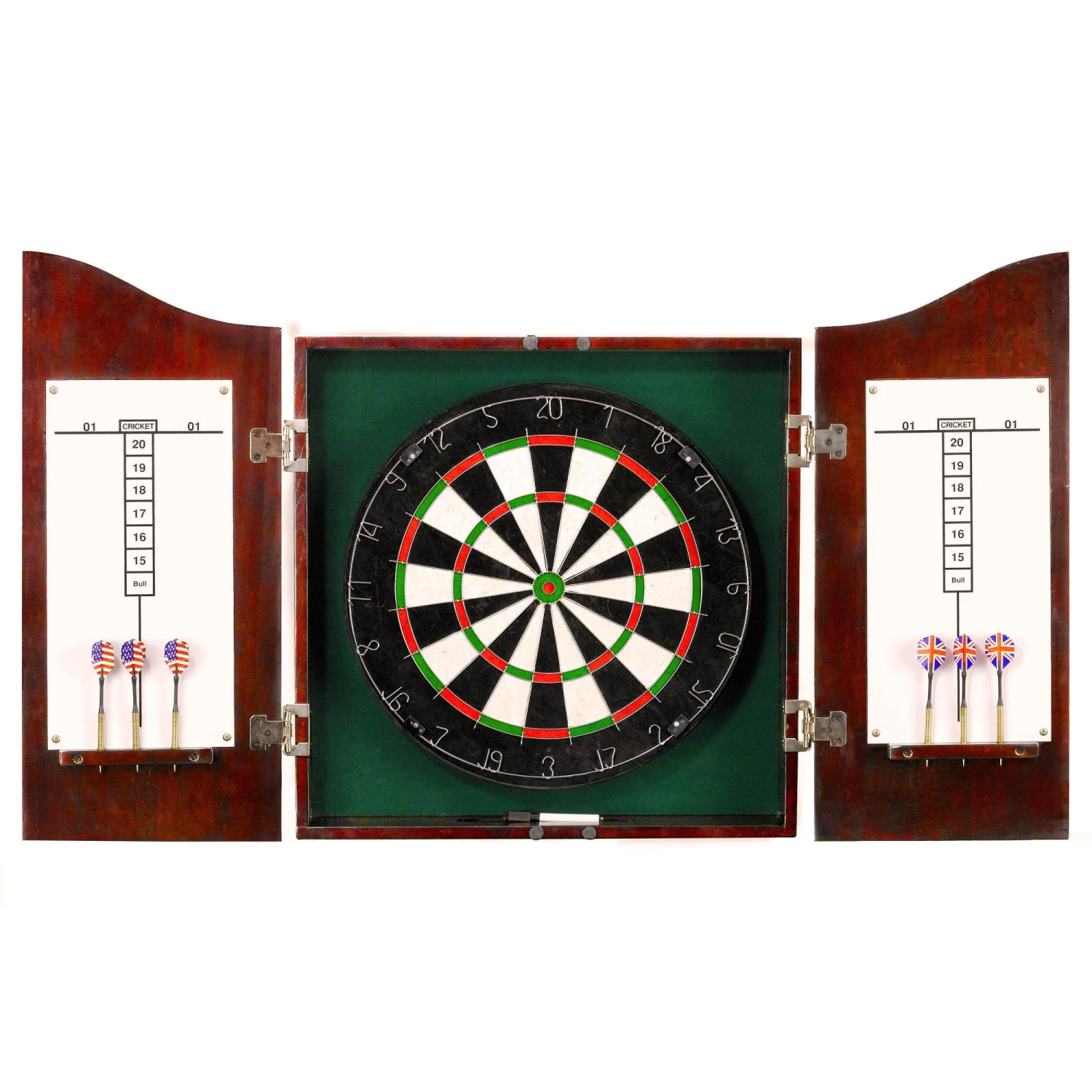 The high-quality furniture grade Dark Cherry finish makes this Centerpoint Dartboard Cabinet Set a great addition to any game room! Everything you need to play a high stakes game of darts is packed into this beautiful solid wood dartboard cabinet set. This high-quality cabinet is made of North American yellow poplar hardwood with a beautiful Dark Cherry finish. The cabinet features two pub style dry erase scoreboards for playing cricket and 01, two sets of darts with American and British flights, and a regulation bristle dartboard with a removable number ring. This handsomely finished cabinet stores and protects your dartboard while protecting your back wall from stray darts during games. It is certain to add a touch of elegance to your game room.