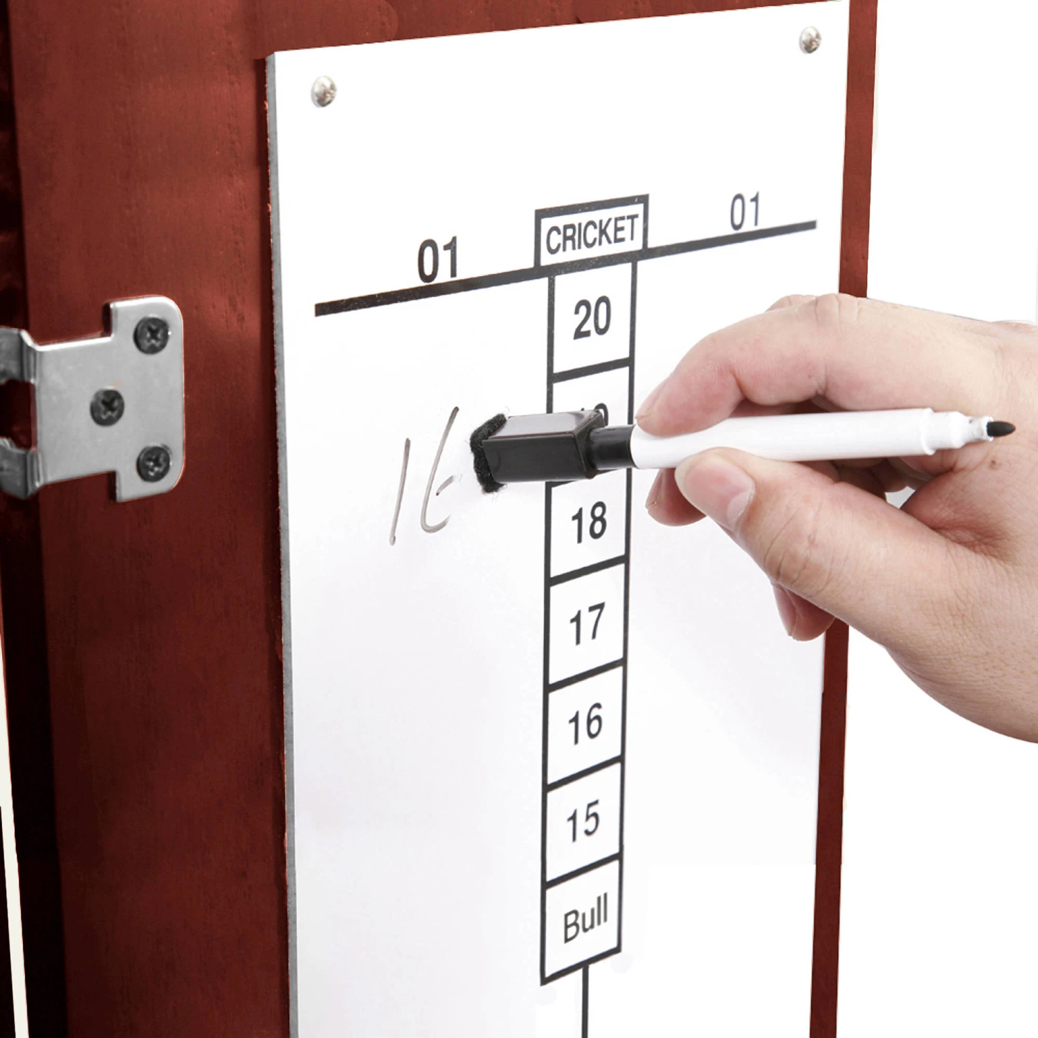 - Includes dual dry erase scoreboards and dart holders on the inside of each door