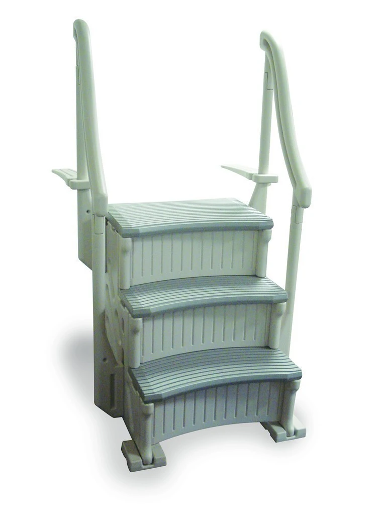 Confer’s first-ever step for inground pools…the Curve. A basic 3-step entry system that comes in an attractive two-tone color warm grey panels and handrails accented by grey treads that compliment any pool. Additional add-on kit (sold separately) extends the width of the base unit while giving it a more sweeping appearance!