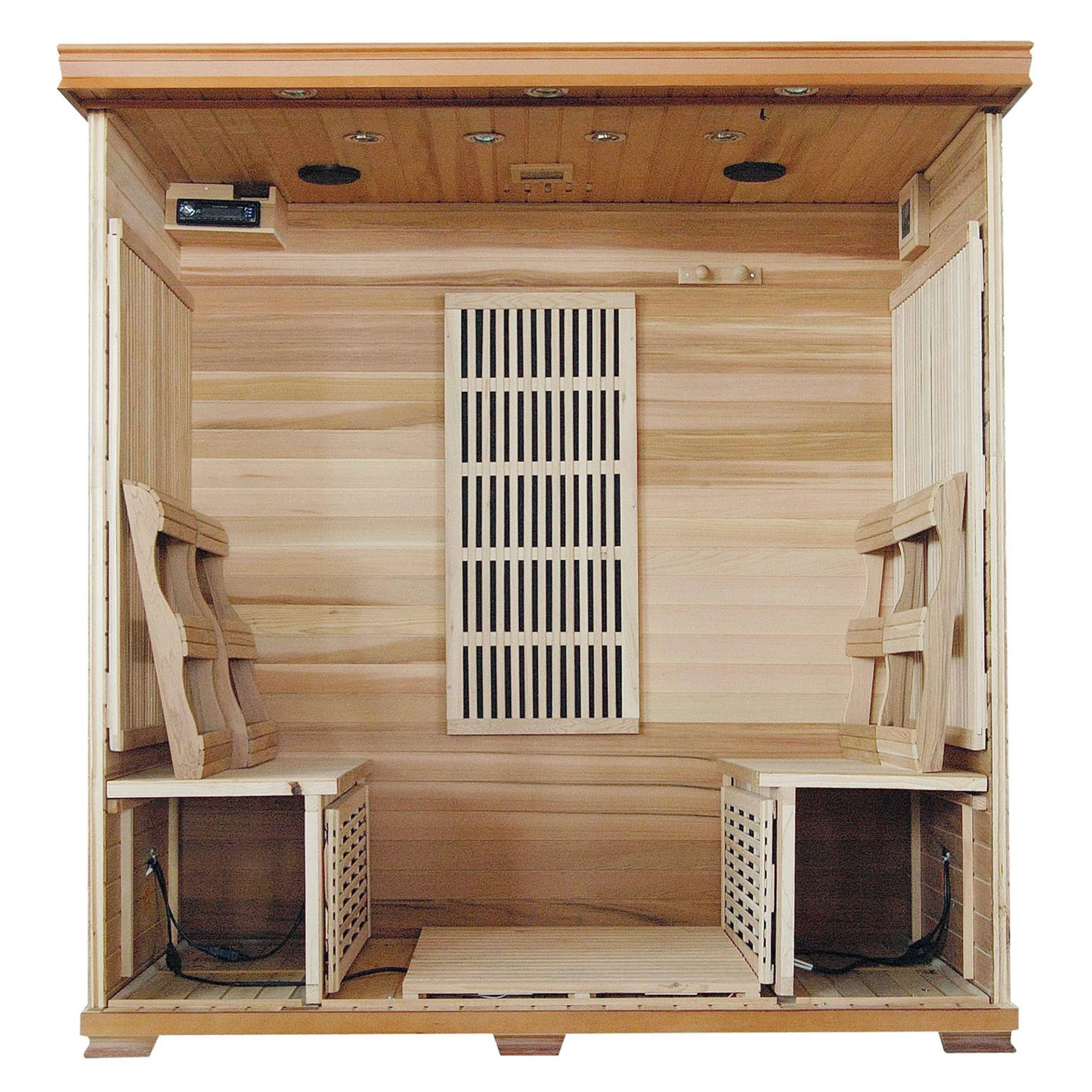 Create the ultimate sauna experience in your own home. This four-person sauna offers a spacious interior that allows you to relax with ease. Constructed from Canadian red cedar, the Cedar Elite sauna has a beautiful, red tone and a pleasant, natural aroma. Nine, low-EMF, carbon heaters provide heat for up to four people, creating the perfect sanctuary for friends and family members. A full-spectrum, color therapy system and an integrated sound system enhances your at-home spa experience.