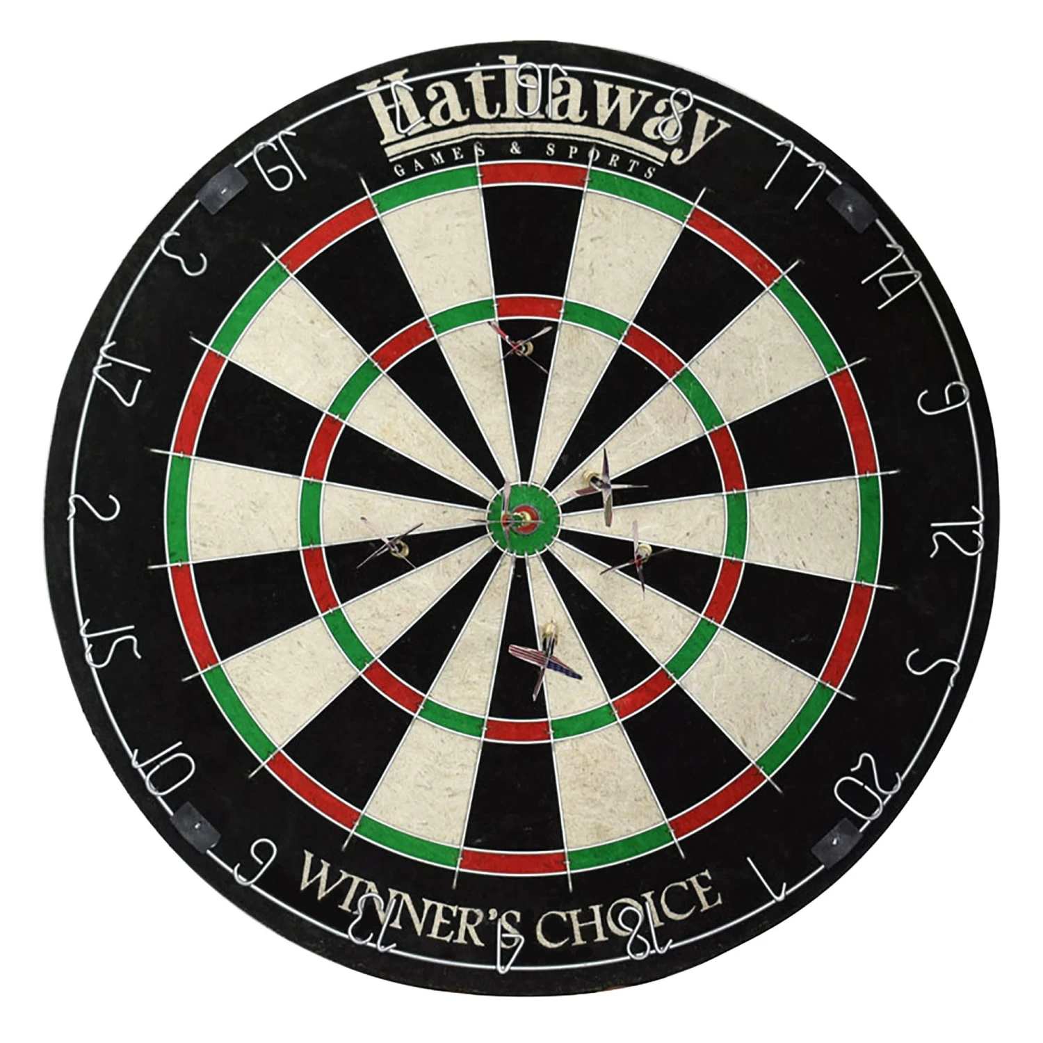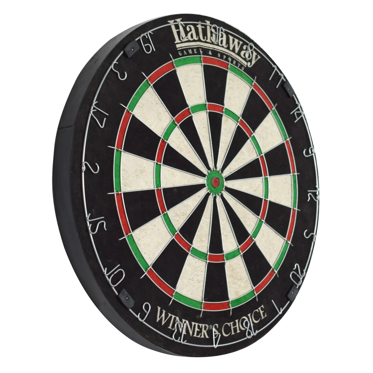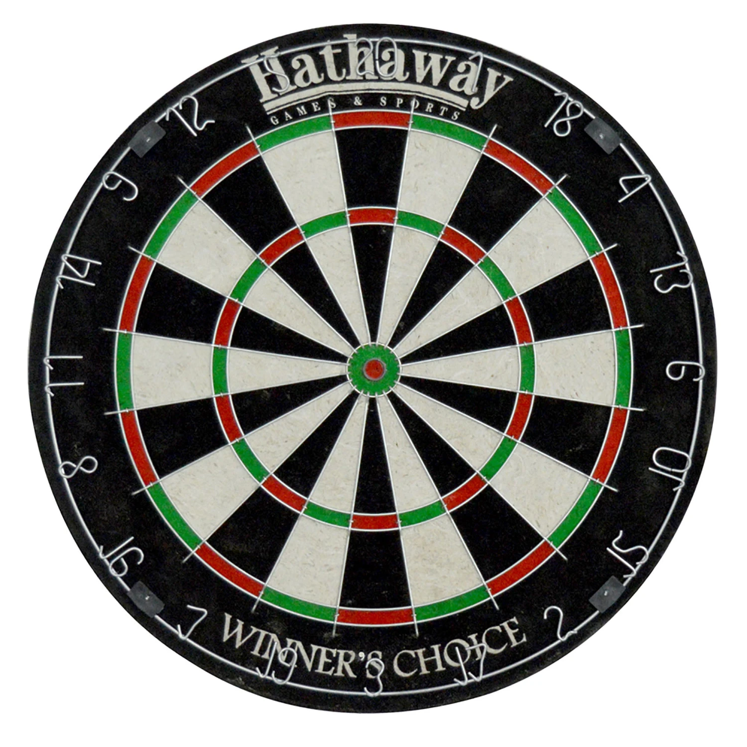 Enjoy a quality game of darts with the Hathaway Winners Choice sisal dart board. Made of superior grade, self-healing sisal fibers, this tournament style dart board features a moveable metal number ring so you can easily rotate your board and extend playing life. This game table features round-shaped wires and a staple-free bull’s-eye to reduce bounce-outs and deliver maximum performance for your dart game. A great board to play on for any experience level.